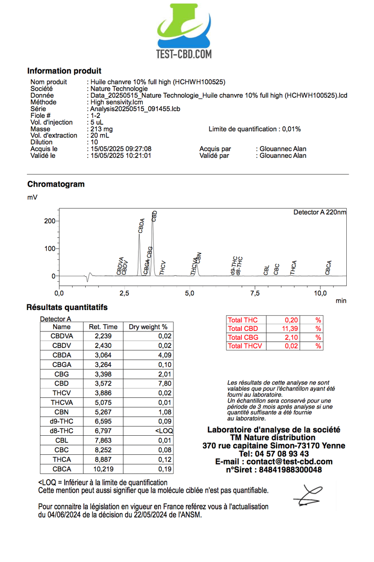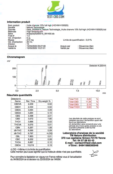Huile de chanvre BIO enrichie en CBD à 10 %, -0,3 % de THC